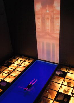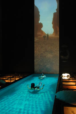 地球上でいちばん低い、海抜マイナス400メートルにある「死海」をテーマにしたパビリオンです。死海の本物の水をタンカーで運び、幅2.5メートル×10メートルの死海プールをつくりました。希望者には展示の一部として参加していただき、本物の死海の水の浮遊体験をお楽しみいただきます。来館者はこれを2階の回廊から眺めながら、ヨルダンの自然の叡智に触れていただく・・・という趣向です。
