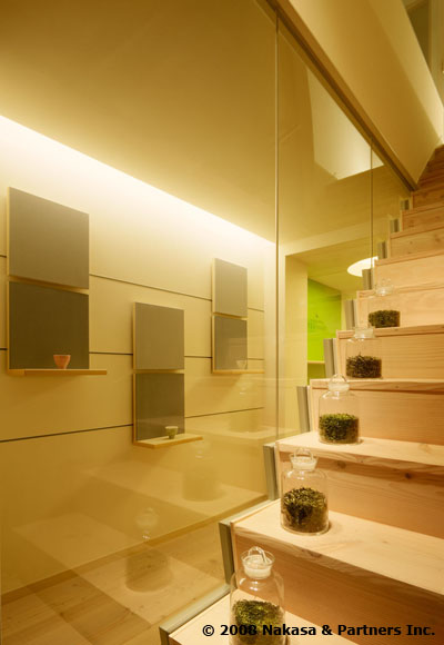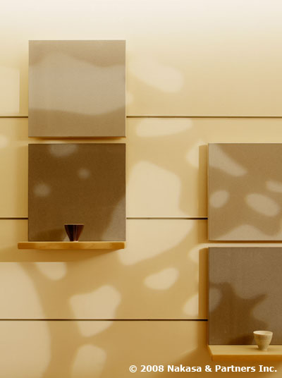ティールームの壁面を構成するのは備長炭エコナフィール。 珪藻土を主原料とする乾式左官材エコナフィールは、新国立美術館の展示収蔵庫にも使用されるすぐれもの。調湿効果に優れ、ホルムアルデヒドをはじめとした各種揮発性有機化合物の吸着、分解性能を有しています。これに紀州備長炭の粉炭を調合したオリジナルの乾式左官材が備長炭エコナフィールです。粉炭の混入量によってグレーのグラデーションが美しい穏やかな質感となっています。