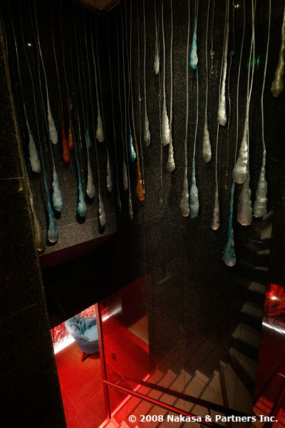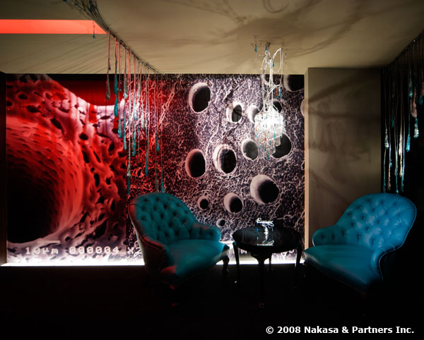 備長炭の電子顕微鏡写真を大きく引き伸ばした壁面は、アングラ劇場一歩手前のユニークな風情。シンプルさを売りとしたこれまでの掌とはイメージを一新し、「お行儀のよい空間」にちょっと飽きた「大人のための遊び心」を具現化。賛否両論はあるのですが、私としては拍手!です。